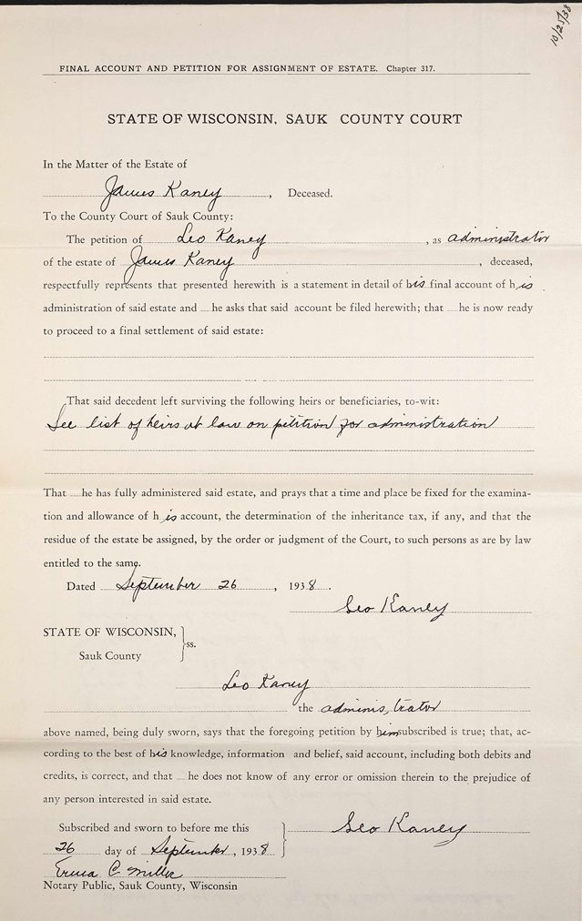 Probate estate petition for heirs of James E Kaney, unmarried, died Apr 1937 Sauk county, Wisconsin