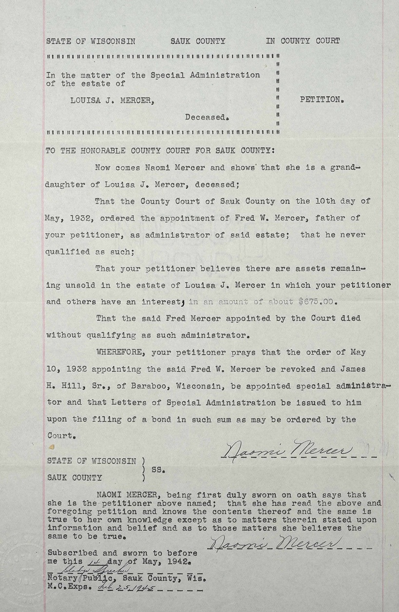 Petition on estate of Louisa Jane (Spyker) Mercer 14 May 1942 Sauk county, Wisconsin