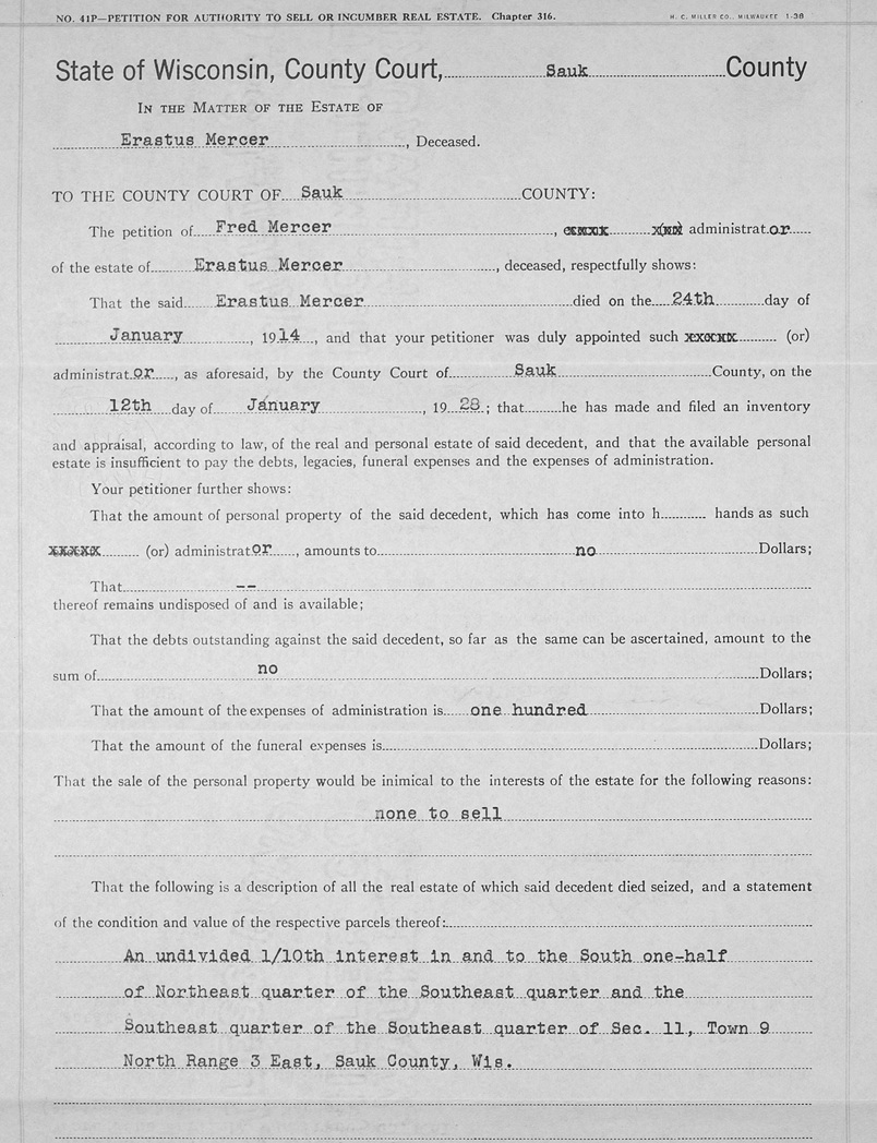 Probate petition for estate of Erastus Mercer by Fred Mercer 08 Mar 1941 Sauk county, Wisconsin - page 1