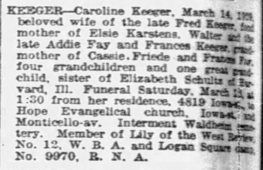 Chicago Tribune (Chicago, Illinois) 16 Mar 1929 - Caroline (Schultz) Keeger obituary