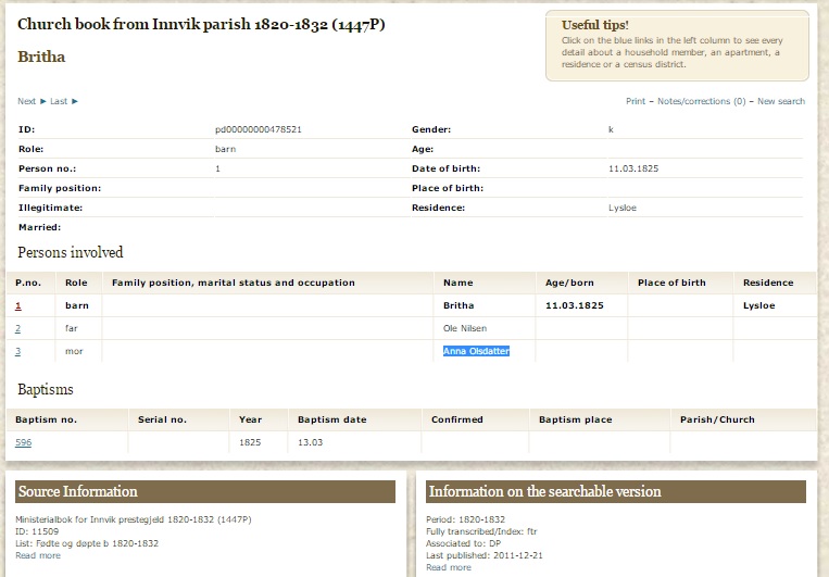 Britha Oldsdatter Lyslo Baptism at Innvik parish 13 Mar 1825 born 11 Mar 1825