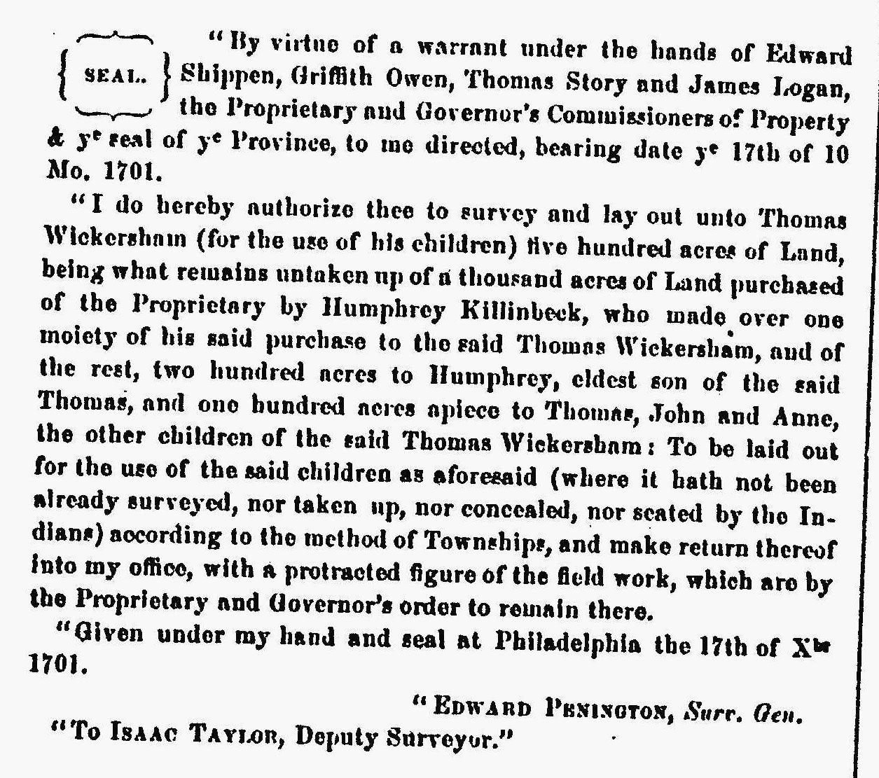History of Chester County, Pennsylvania - land warrant for Thomas Wickersham 1700