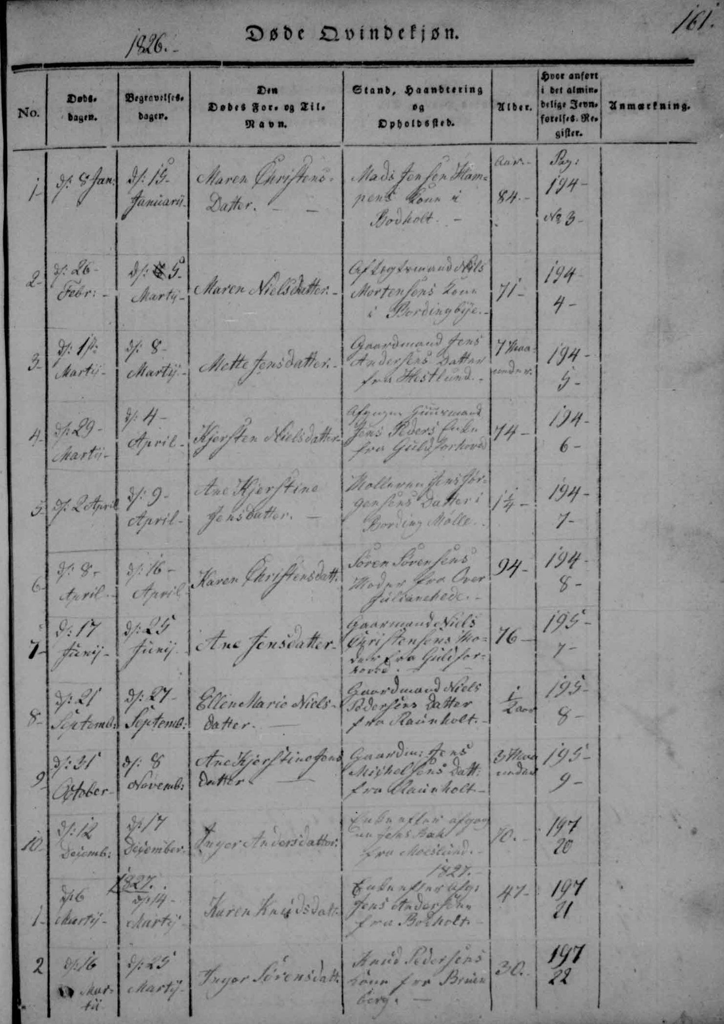 Inger Sorensdatter death 16 Mar 1827, Page 161, Image 85, Ringkøbing, Hammerum, Bording Kontraministerialbog (1826 - 2002) Denmark