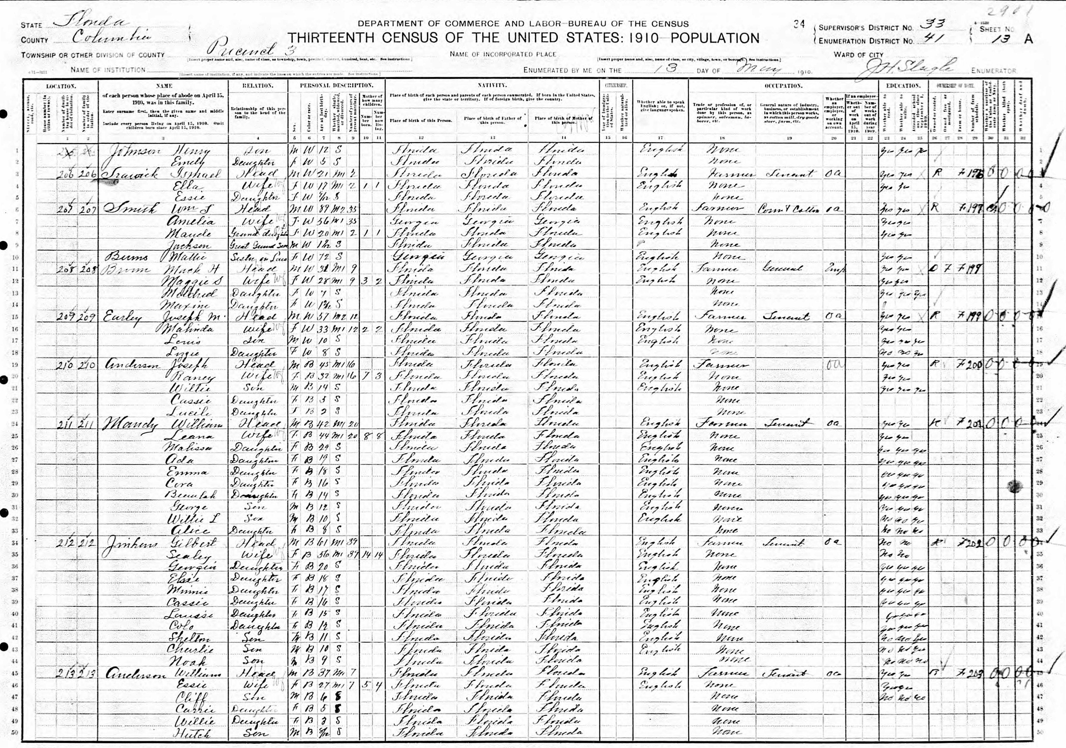 1910 census Suwanee Shoals, Columbia, FL ED41 - Anderson, William