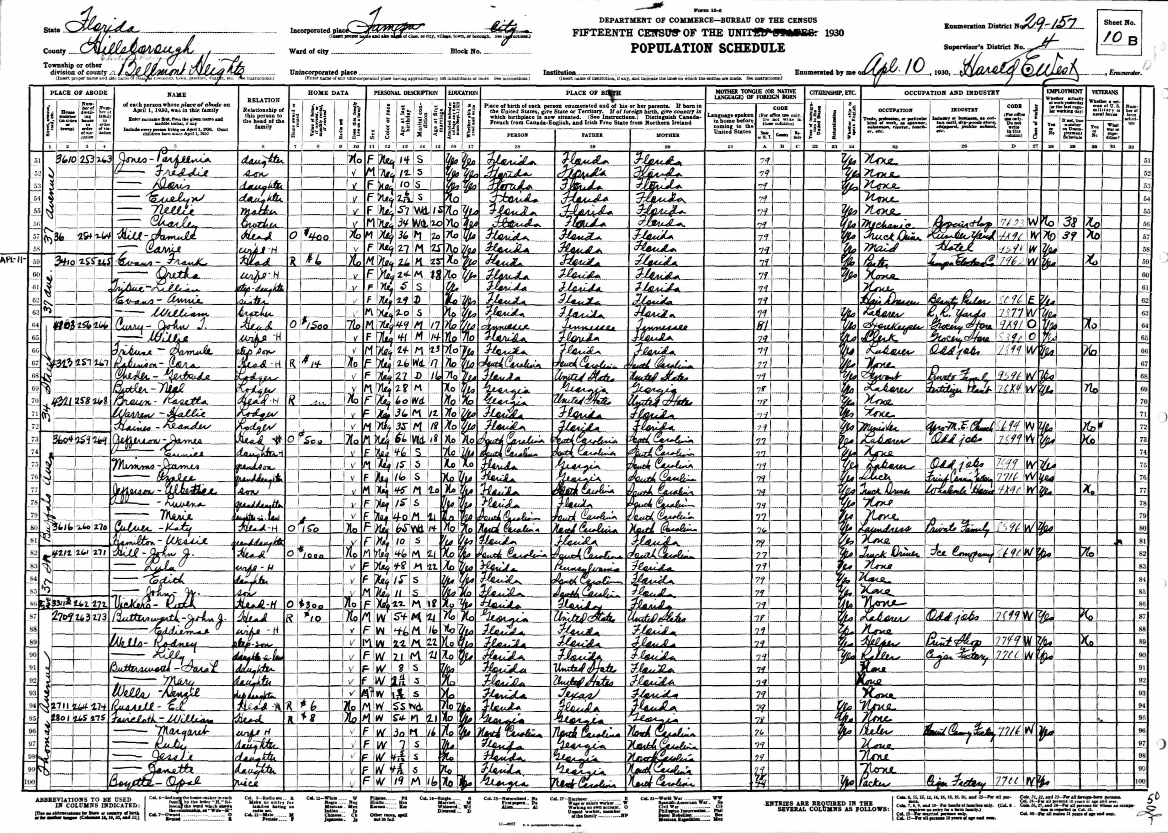 1930 census Belmont Heights, Hillsborough, FL - Hill, John J