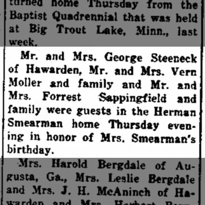 Mr and Mrs Vern Mollet and family were guests in the Herman Smearman home in honor of Mrs Smearman's birthday. 01 Sep 1955 The Independent (Hawarden, IA)
