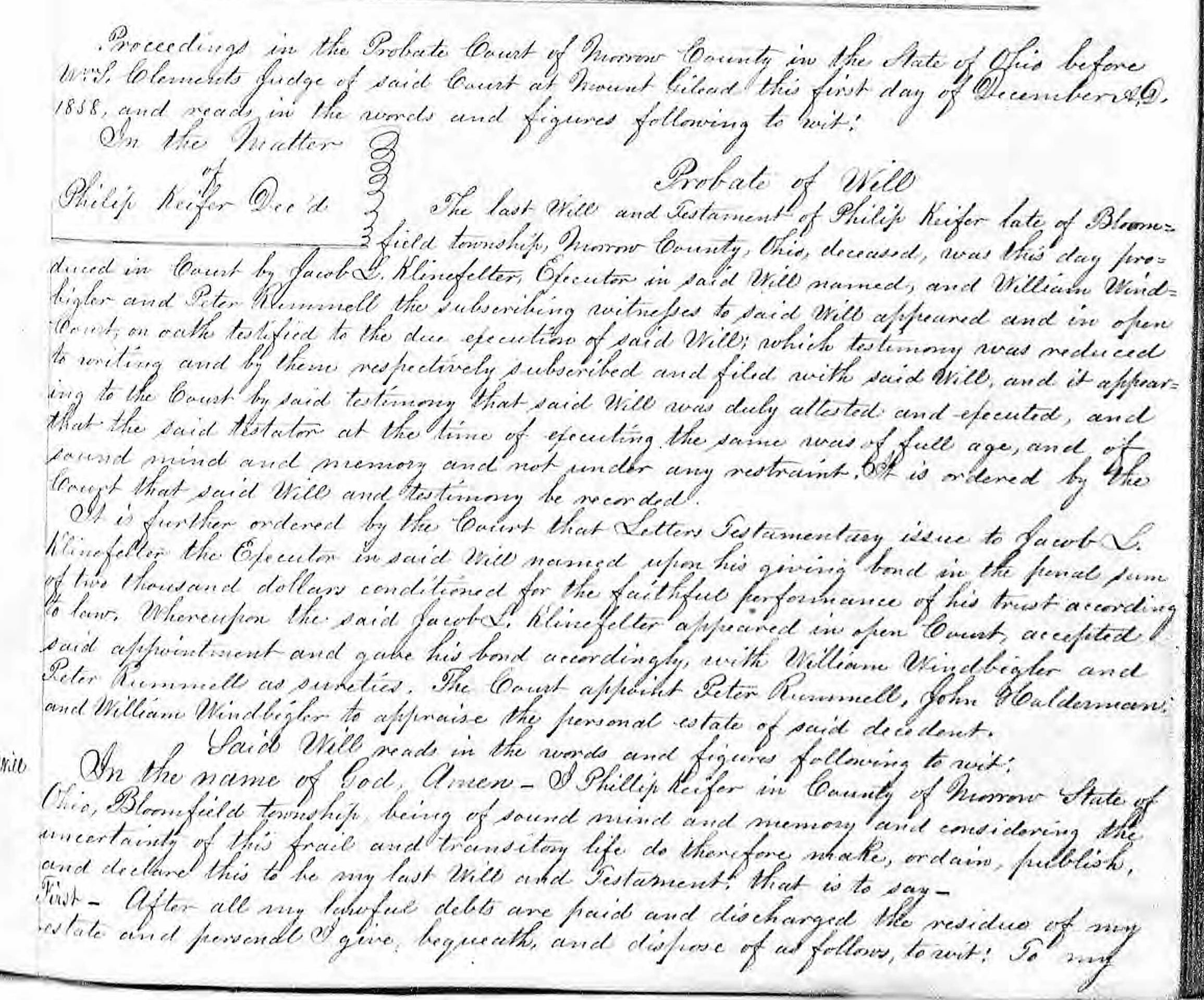 Will of Philip Keifer (Kiefer) - Morrow, OH - 09 Oct 1858 - page 1