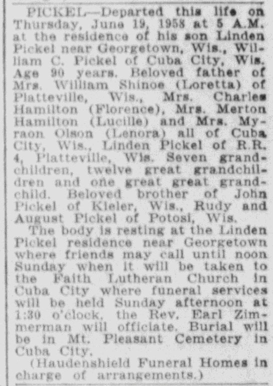 Dubuque Telegraph Herald June 20, 1958 - William C Pickel obituary