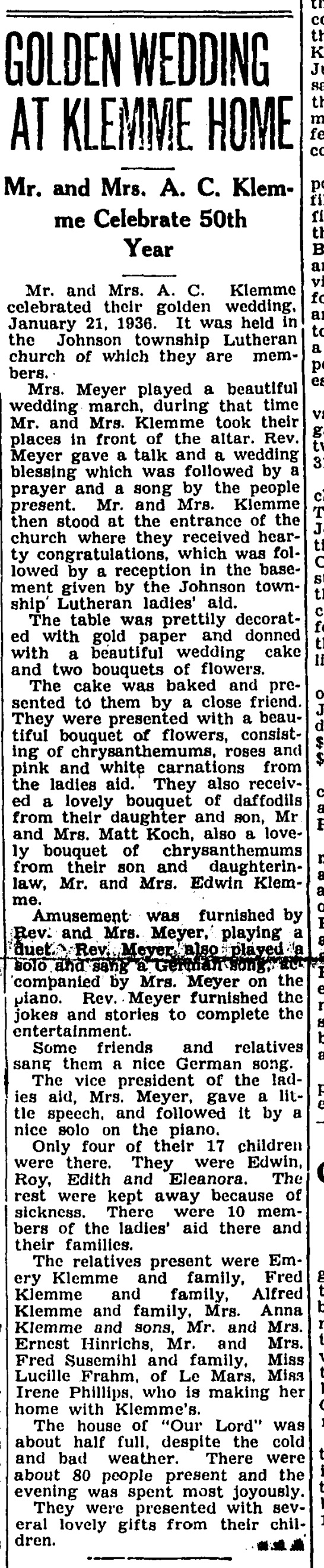 Lemars Globe Post January 30, 1936 - A C and Anna (Frahm) Klemme 50th wedding anniversary