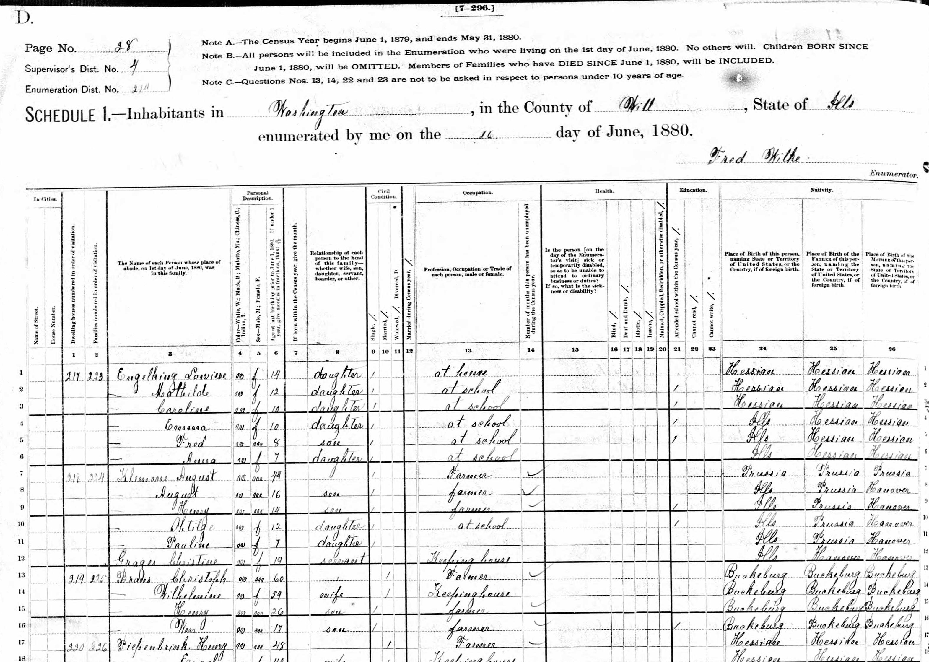 1880 US Census - Washington, Will, IL ED214 - Klemme, August