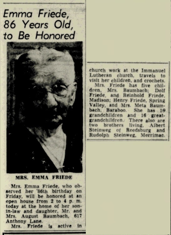 Madison Wisconsin State Journal June 12, 1955 - Emma (Goldmund) Friede, 86, birthday celebration