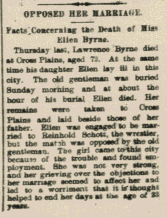 Madison Wisconsin State Journal July 23, 1890 - Ellen Byrne obituary