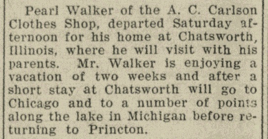 Princeton Bureau County Tribune August 27, 1909 - Pearl Walker visited his parents