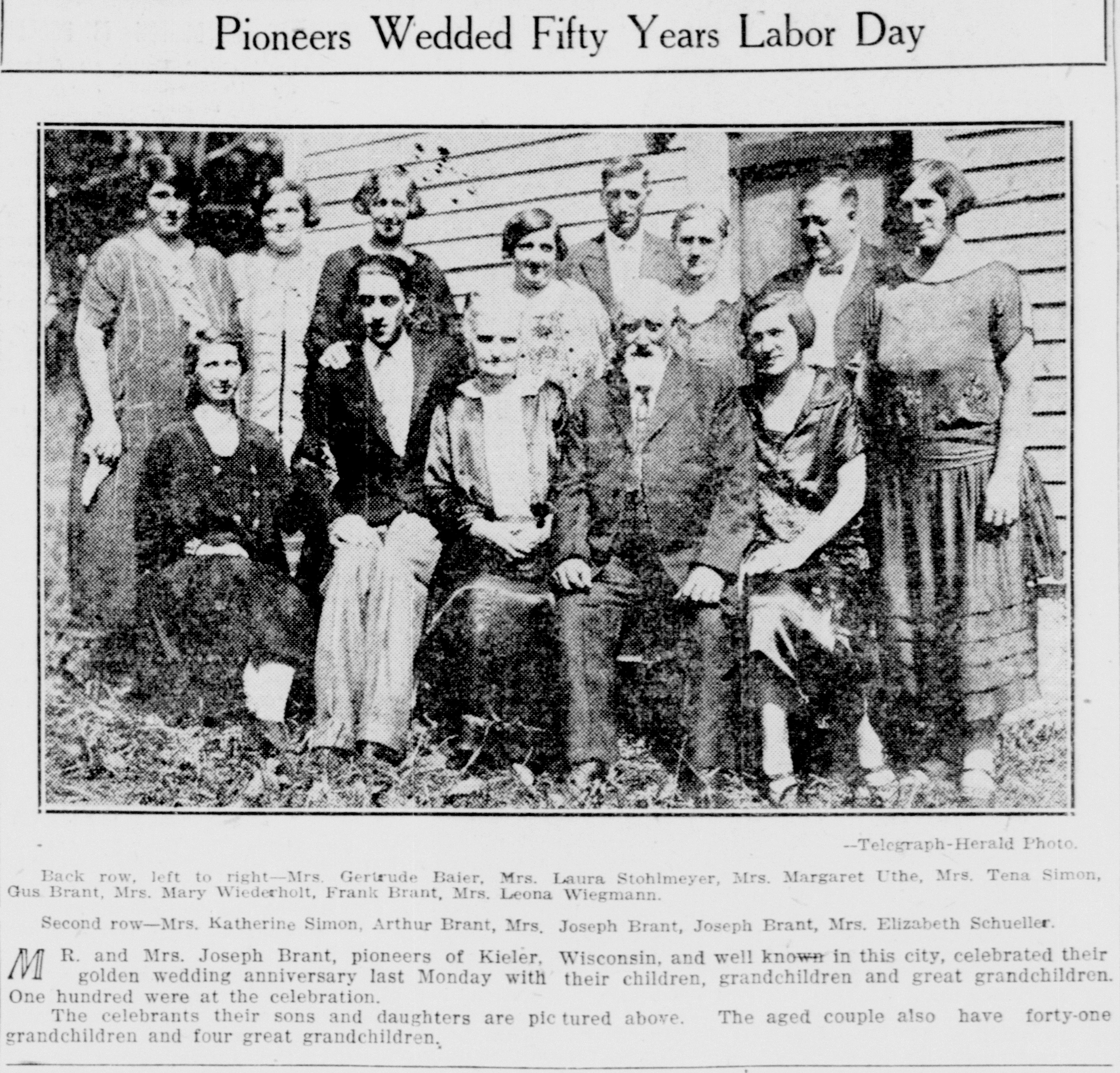Dubuque Telegraph Herald September 13, 1925 - Joseph and Dora (Haas) Brant celebrate 50th wedding anniversary with their children