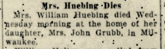 Madison Wisconsin State Journal December 16, 1925 - Mrs William Huebing (Catherine Kipp) obituary
