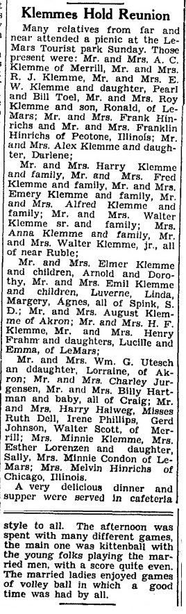Lemars Globe Post July 26, 1937 - Klemme family reunion