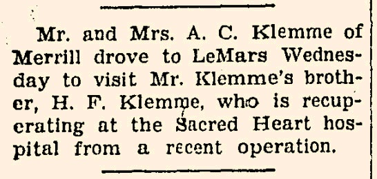 Lemars Globe Post September 8, 1932 - Mr and Mrs A C Klemme visiting his brother H F Klemme who is recuperating from a recent operation