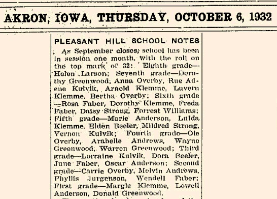 Akron Register Tribune October 6, 1932 - Pleasant Hill School enrollment list
