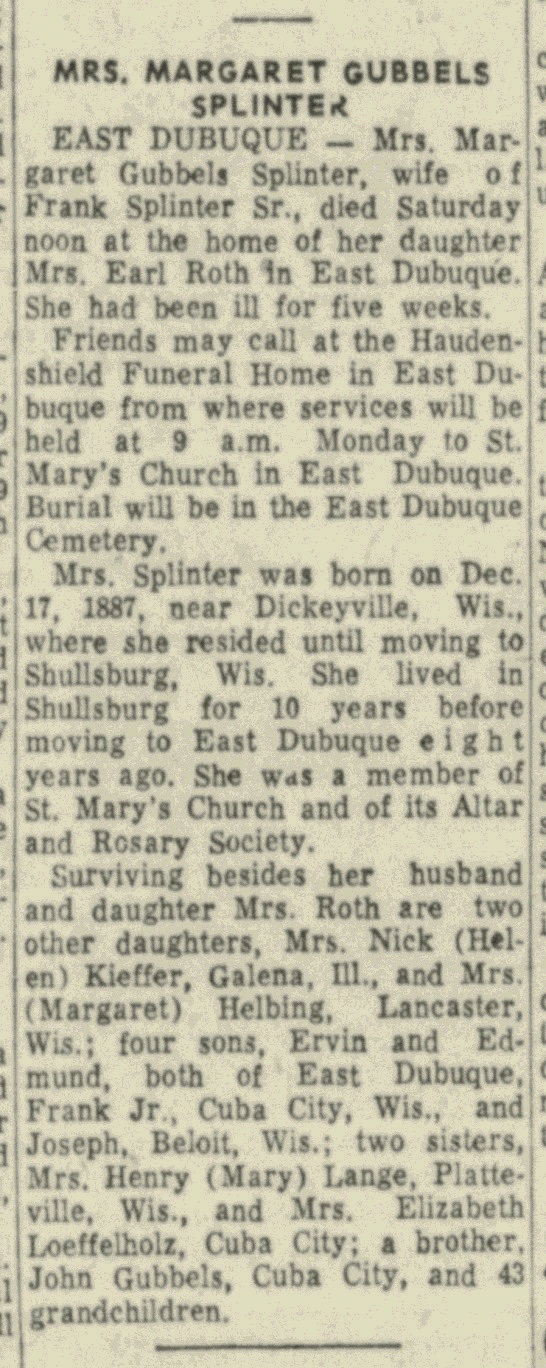 Dubuque Telegraph Herald October 16, 1955 - Margaret (Gubbels) Splinter obituary