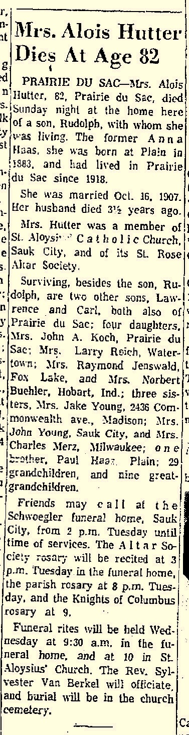 Madison Capital Times May 9, 1966 - Mrs Alois Hutter (Anna Haas) obituary