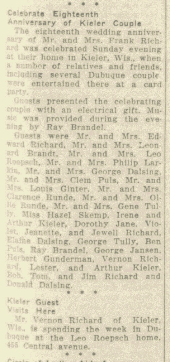 Dubuque Telegraph Herald February 3, 1936 - Frank and Louise (Gunderman) Richard 18th wedding anniversary celebration