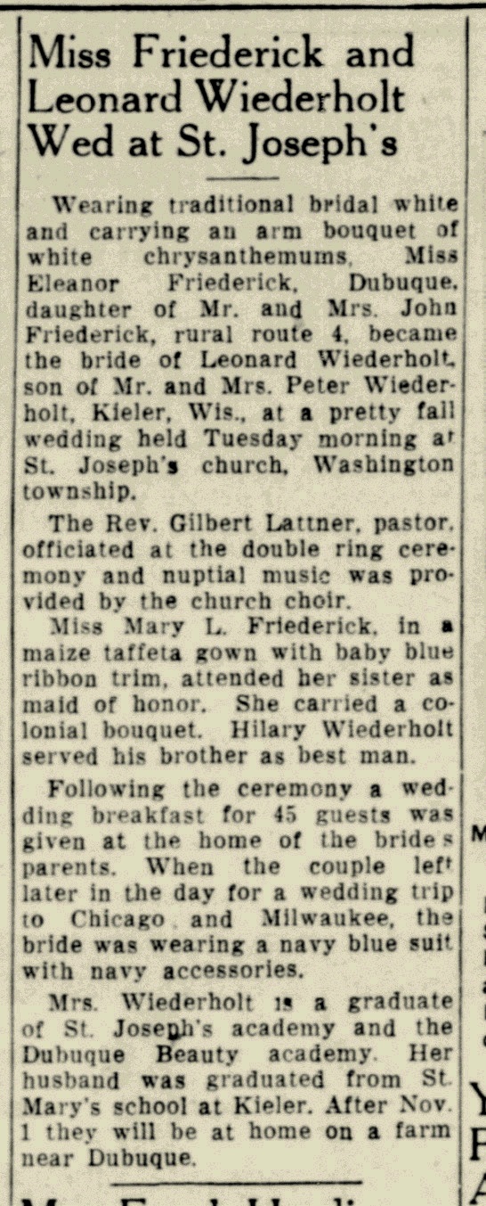 Dubuque Telegraph Herald October 25, 1945 - Eleanor Friederick and Leonard Wiederholt marriage announcement