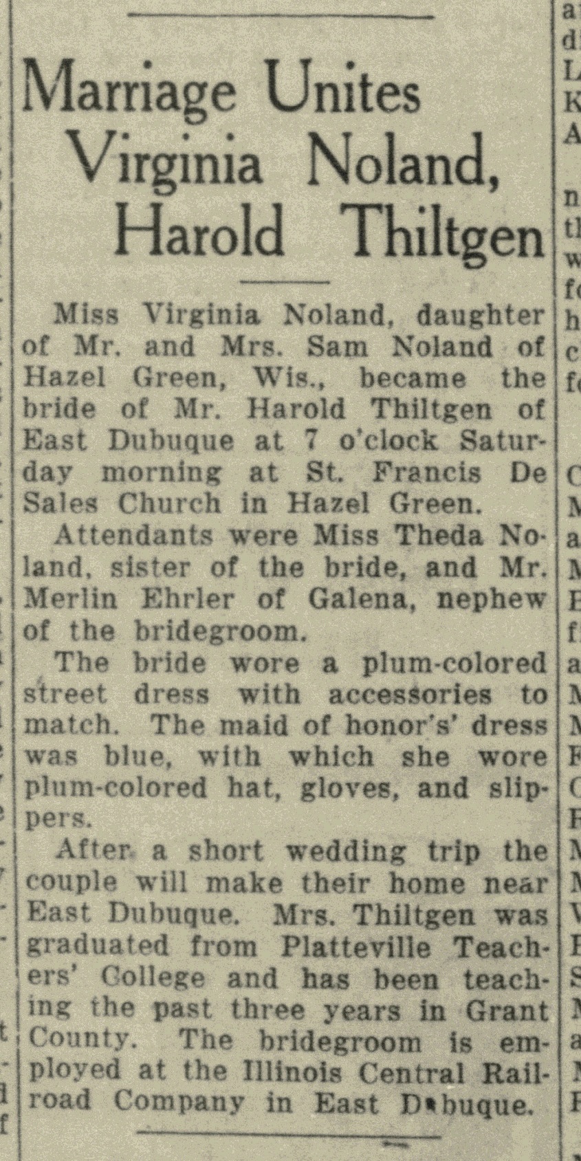 Dubuque Telegraph Herald October 29, 1939 - Virginia Noland and Harold Thiltgen marriage announcement