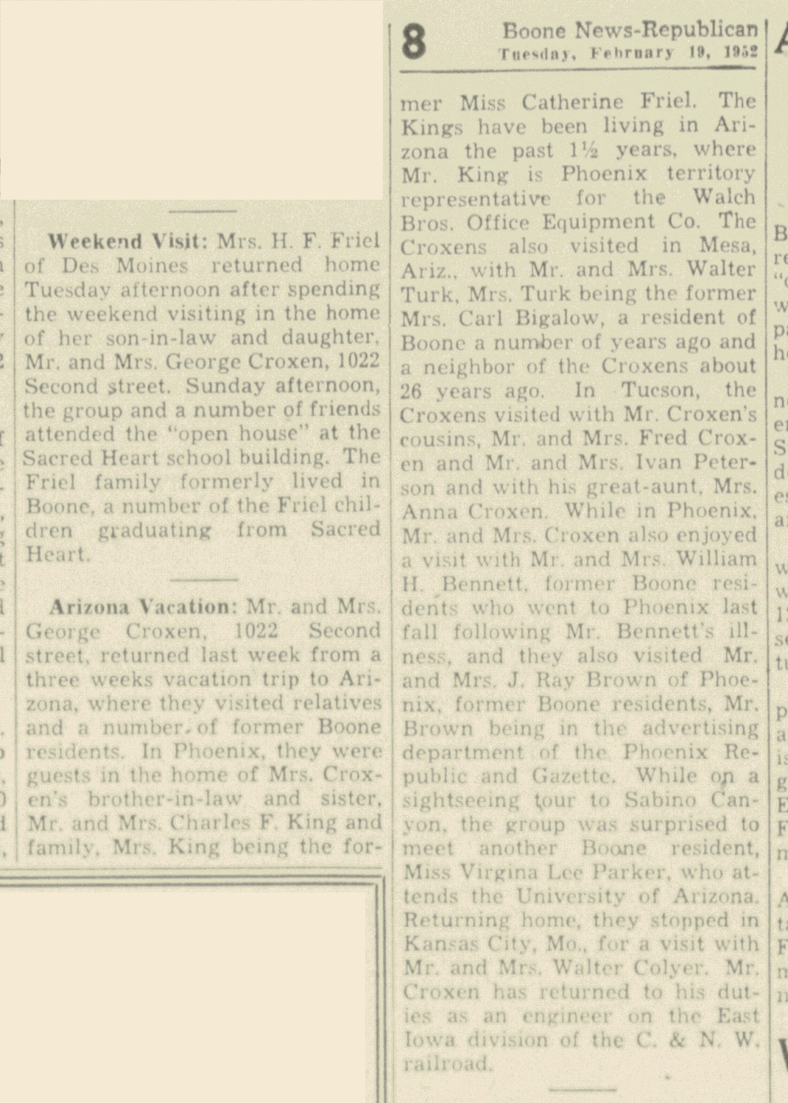 Boone News Republican February 19, 1952 - Trips by Mrs H F Friel and George and Elsie (Friel) Croxen