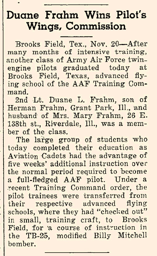 Riverdale Pointer November 30, 1944 - Duane Leonard Frahm wins pilots wings, commission