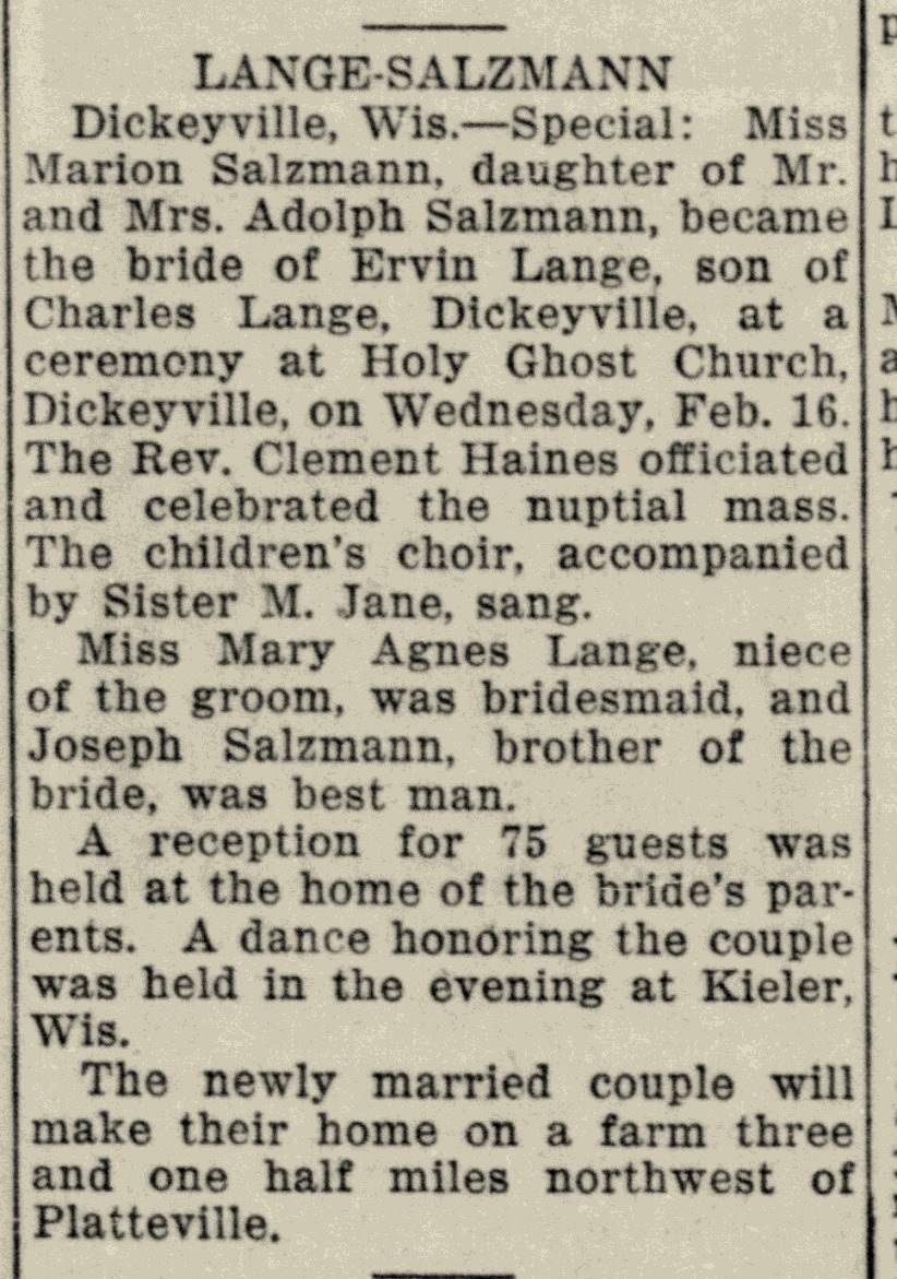Dubuque Telegraph Herald February 22, 1944 - Marian Salzmann and Ervin Lange marriage announcement