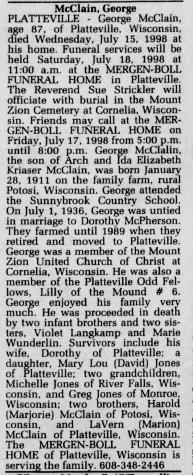 - [S373] U.S. Federal Census 1940 U.S. Federal Census, by Ancestry.com, Year: 1940; Census Place: Harrison, Grant, Wisconsin; Roll: T627_4481; Page: 4B; Enumeration District: 22-17.