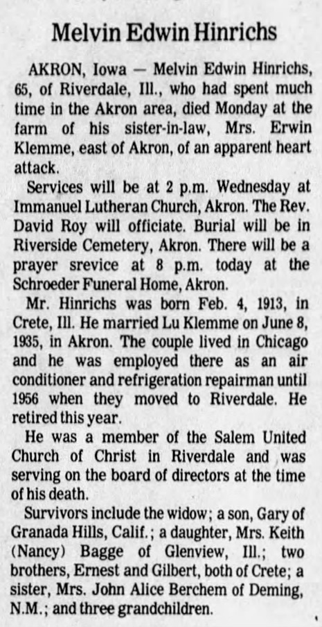 Child of Melvin Edwin Hinrichs and Lulu Rosena Klemme