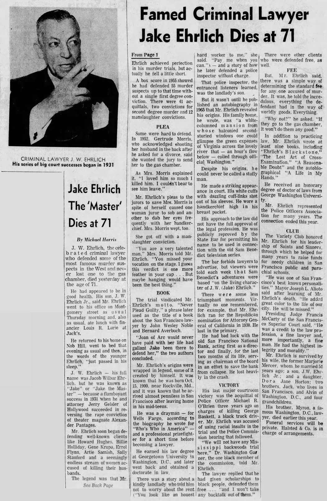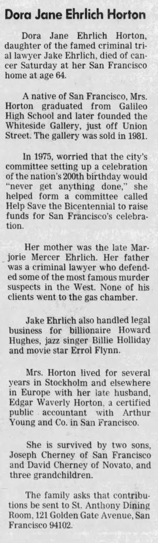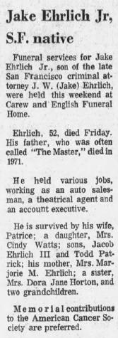 - [S268] San Francisco Examiner, Jake Ehrlich obituary.