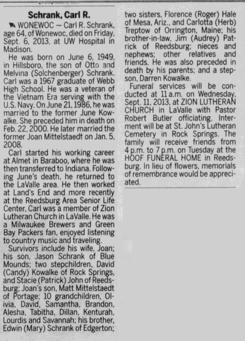 - Carl Raymond Schrank+ b. 6 Jun 1949, d. 6 Sep 2013