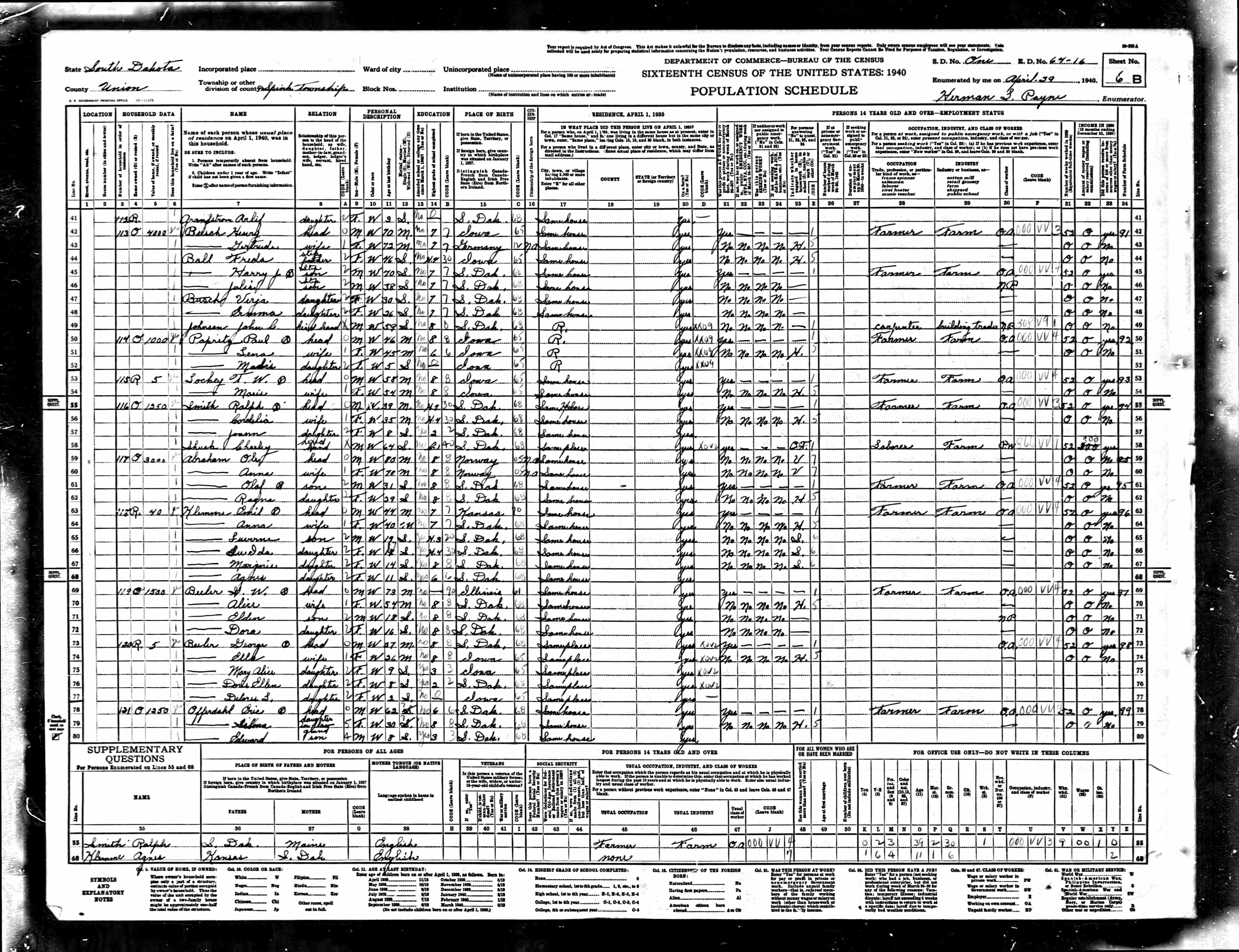 | 29 April 1940 | Spink, Union, South Dakota | Lu Ida Olive Klemme was listed as a daughter in Emil Fred Klemme's household on the 1940 Census at Spink, Union, South Dakota; Name Emil Klemme Respondent Yes Age 44 Estimated Birth Year abt 1896 Gender Male Race White Birthplace Kansas Marital Status Married Relation to Head of House Head Home in 1940 Spink, Union, South Dakota Map of Home in 1940 Spink, Union, South Dakota Farm YES Inferred Residence in 1935 Spink, Union, South Dakota Residence in 1935 Spink Resident on farm in 1935 Yes Sheet Number 6B Number of Household in Order of Visitation 118 Occupation Farmer House Owned or Rented Rented Value of Home or Monthly Rental if Rented 40 Attended School or College No Highest Grade Completed Elementary school, 7th grade Class of Worker Working on own account Weeks Worked in 1939 52 Income 0 Income Other Sources Yes ; living next door to Ole Abraham (Abrahamson.)3 |