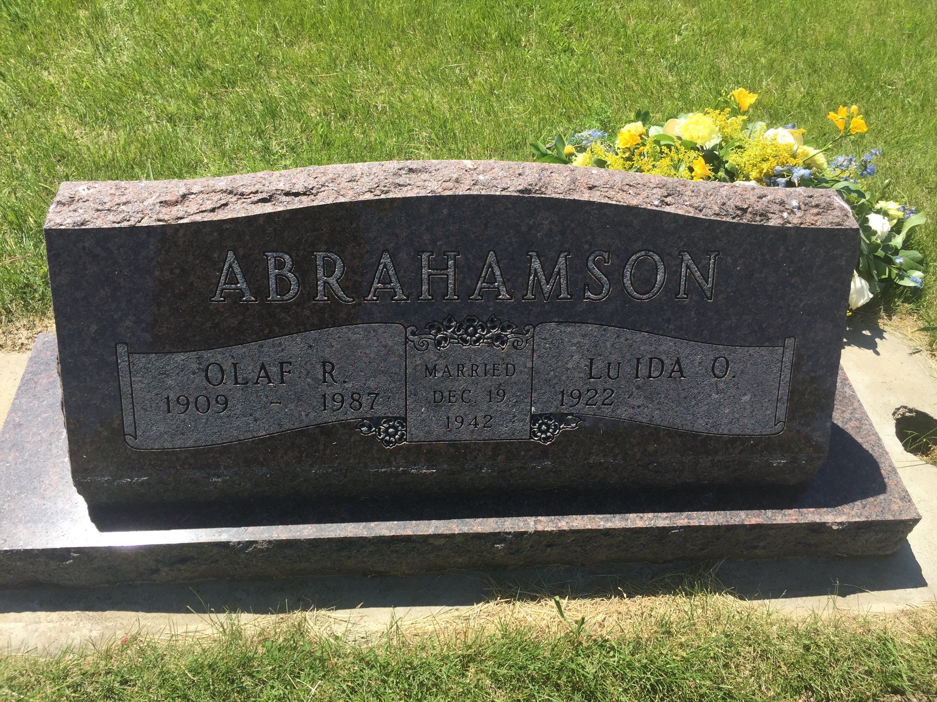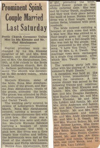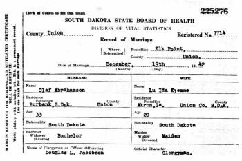 | Marriage | 19 December 1942 | He married Lu Ida Olive Klemme, daughter of Emil Fred Klemme and Anna Marie Lykken, on 19 December 1942 at Brule Creek Church, Elk Point, Union, South Dakota, County of Residence: Union. Post Office: Burbank; Prominent Spink Couple Married Last Saturday - Pretty Church Ceremony Unites Miss Lu Ida Klemme and Mr. Olaf Abrahamson - Nuptial promises were exchanged by Lu Ida Klemme daughter of Mr. and Mrs. Emil Klemme, and Olaf Abrahamson, son of Mrs. Ole Abrahamson, Dec. 19th, at 6:00 o'clock in the Brule Creek Lutheran church, Rev. D. L. Jacobson performing the ceremony. The church was decorated in the bride's colors, white and blue. Marjorie Klemme, sister of the bride, Nona Mae Abrahamson, niece of the groom, and Norma Jean Abrahamson, cousin of the groom, attended the bride. The groom was attended by Philip Abrahamson, Luverne Klemme, and Carter Twedt. The wedding party entered to strains of Lohengrin's Wedding March. Nona Mae Abrahamson entered, carrying a bouquet of yellow chrysanthemums tied with a pink bow. Her dress was a floor length blue satin and chiffon. Marjorie Klemme followed carrying a bouquet of white chrysanthemums tied with a pink bow. Her dress was a floor length blue chiffon and taffeta. The bridesmaids were met at the front of the church by Luvern Klemme and Philip Abrahamson. Norma Jean Abrahamson, flower girl, preceding the bride, strewed flower petals on the white carpeted aisle. She was met by Carter Twedt, ringbearer, and they took their place before the maid of honor. Norma Jean's dress was a floor length white cotton Swiss, trimmed with pink rosebuds. The bride entered carrying a bouquet of pink roses tied with a blue bow. She was attired in a floor-length gown of ivory pan satin and wore a full-length veil. She was met by the groom and they proceeded to the altar. The song, "I Love You Truly," was sung by Mrs. L. S. Twedt. The marriage vows were exchanged in a single ring ceremony, after which Mrs. Twedt sang "Because." The wedding party left the altar with the playing of "A Midsummer's Night Dream." The reception was held at the bride's home, immediately following the ceremony. A two course dinner was served to the following friends and relatives: Mr. and Mrs. Emil Klemme and family, Mrs. Ole Abrahamson, Rev. and Mrs. Douglas Jacobson, Miss Rachel Olson, Mr. and Mrs. Elmer Klemme, Mr. and Mrs. Ola Lykken and family, Mr. and Mrs. Alvin Anderson and family, Mr. and Mrs. Clarence Andrews and family, Mr. and Mrs. Norman Abrahamson and family, Mr. and Mrs. Andy Abrahamson, Mr. and Mrs. L. S. Twedt, Mr. and Mrs. Warren Solbue, Mr. and Mrs. Selmer Larson, Miss Dorothy Hofland, Miss Ruth Lykken, Miss Edith Zetterland, Miss Ardis Stoen, Miss Evelyn Clostergaard, Mr. and Mrs. Art Abrahamson and family, Misses Judith and Olive Wevik, and Mrs. And Mrs. Lars Lykken.1 |