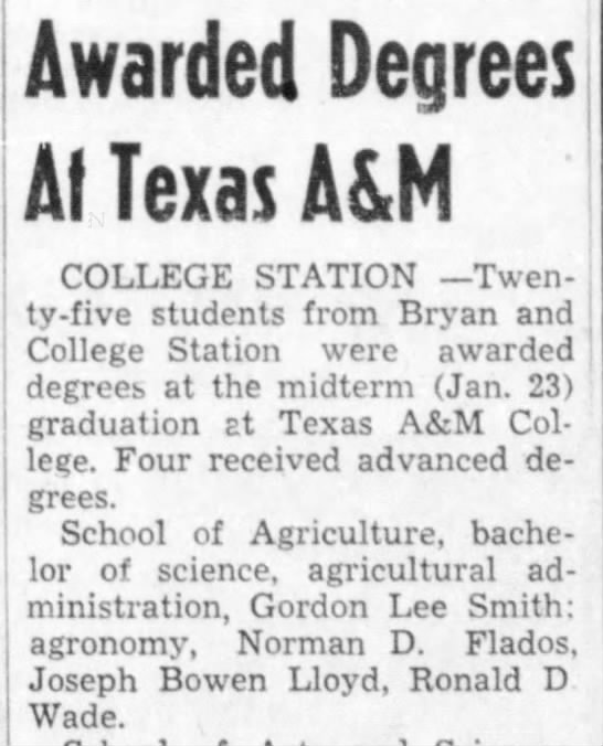 | 23 January 1954 | Texas | On 23 January 1954 at Texas Norman D Flados awarded degree from Texas A&M University. |