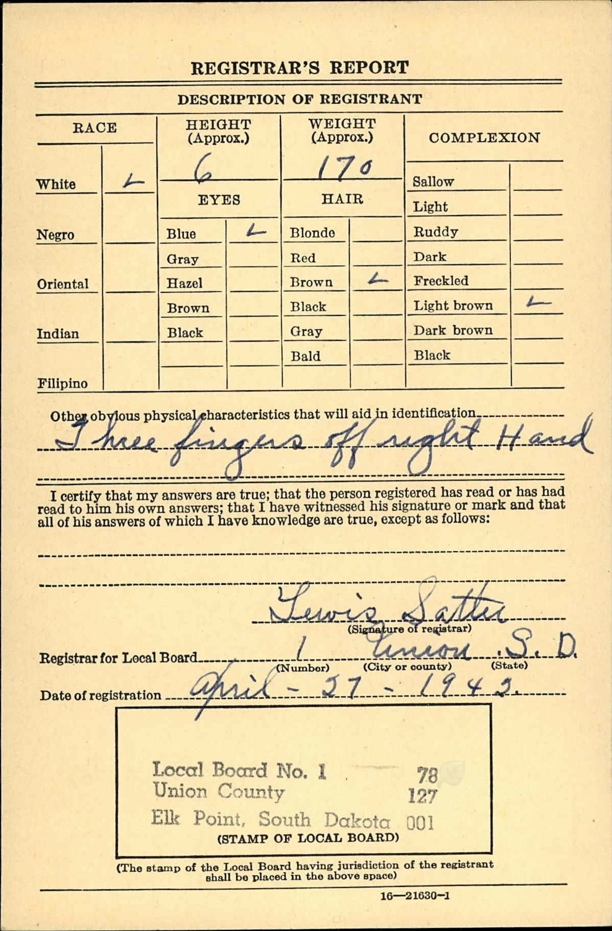 | 19 December 1942 | Brule Creek Church, Elk Point, Union, South Dakota | He witnessed the marriage of Lu Ida Olive Klemme and Olaf Robert Abrahamson on 19 December 1942 at Brule Creek Church, Elk Point, Union, South Dakota; County of Residence: Union. Post Office: Burbank; Prominent Spink Couple Married Last Saturday - Pretty Church Ceremony Unites Miss Lu Ida Klemme and Mr. Olaf Abrahamson - Nuptial promises were exchanged by Lu Ida Klemme daughter of Mr. and Mrs. Emil Klemme, and Olaf Abrahamson, son of Mrs. Ole Abrahamson, Dec. 19th, at 6:00 o'clock in the Brule Creek Lutheran church, Rev. D. L. Jacobson performing the ceremony. The church was decorated in the bride's colors, white and blue. Marjorie Klemme, sister of the bride, Nona Mae Abrahamson, niece of the groom, and Norma Jean Abrahamson, cousin of the groom, attended the bride. The groom was attended by Philip Abrahamson, Luverne Klemme, and Carter Twedt. The wedding party entered to strains of Lohengrin's Wedding March. Nona Mae Abrahamson entered, carrying a bouquet of yellow chrysanthemums tied with a pink bow. Her dress was a floor length blue satin and chiffon. Marjorie Klemme followed carrying a bouquet of white chrysanthemums tied with a pink bow. Her dress was a floor length blue chiffon and taffeta. The bridesmaids were met at the front of the church by Luvern Klemme and Philip Abrahamson. Norma Jean Abrahamson, flower girl, preceding the bride, strewed flower petals on the white carpeted aisle. She was met by Carter Twedt, ringbearer, and they took their place before the maid of honor. Norma Jean's dress was a floor length white cotton Swiss, trimmed with pink rosebuds. The bride entered carrying a bouquet of pink roses tied with a blue bow. She was attired in a floor-length gown of ivory pan satin and wore a full-length veil. She was met by the groom and they proceeded to the altar. The song, "I Love You Truly," was sung by Mrs. L. S. Twedt. The marriage vows were exchanged in a single ring ceremony, after which Mrs. Twedt sang "Because." The wedding party left the altar with the playing of "A Midsummer's Night Dream." The reception was held at the bride's home, immediately following the ceremony. A two course dinner was served to the following friends and relatives: Mr. and Mrs. Emil Klemme and family, Mrs. Ole Abrahamson, Rev. and Mrs. Douglas Jacobson, Miss Rachel Olson, Mr. and Mrs. Elmer Klemme, Mr. and Mrs. Ola Lykken and family, Mr. and Mrs. Alvin Anderson and family, Mr. and Mrs. Clarence Andrews and family, Mr. and Mrs. Norman Abrahamson and family, Mr. and Mrs. Andy Abrahamson, Mr. and Mrs. L. S. Twedt, Mr. and Mrs. Warren Solbue, Mr. and Mrs. Selmer Larson, Miss Dorothy Hofland, Miss Ruth Lykken, Miss Edith Zetterland, Miss Ardis Stoen, Miss Evelyn Clostergaard, Mr. and Mrs. Art Abrahamson and family, Misses Judith and Olive Wevik, and Mrs. And Mrs. Lars Lykken.4 |