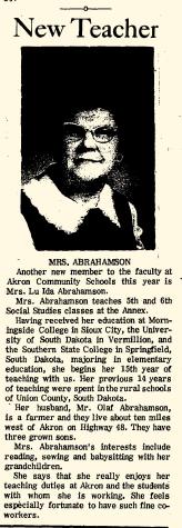 | October 1970 | Akron, Plymouth, Iowa | She was a LuIda Abrahamson new teacher at Akron Community Schools in October 1970 at Akron, Plymouth, Iowa. |