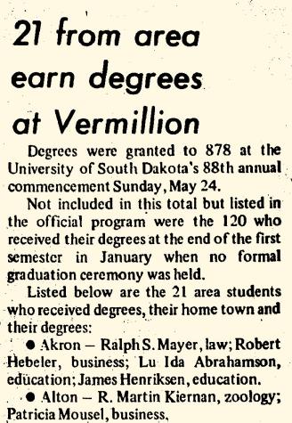 | May 1970 | University of South Dakota-Vermillion, Vermillion, South Dakota | Lu Ida Olive Klemme obtained a degree in May 1970 at University of South Dakota-Vermillion, Vermillion, South Dakota, In May 1970, LuIda graduated from the University of South Dakota in Vermillion, South Dakota with a bachelor of Science in Elementary Education.7 |