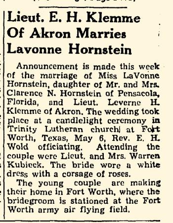 | Marriage | 3 May 1944 | LaVonne Jean Hornstein married Leverne Harold Klemme, son of Emil Fred Klemme and Anna Marie Lykken, on 3 May 1944 at Fort Worth, Texas, Leverne Klemme and LaVonne Hornstein marriage announcement. |