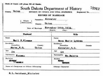 - [S342] South Dakota, South Dakota Marriage Certificates, 1905-1949.