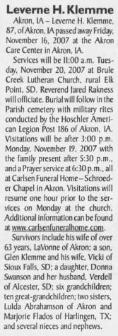 | 1983 | RR #2, Akron, Iowa | As of 1983, Leverne Harold Klemme's address was RR #2, Akron, Iowa; but they live in southeastern South Dakota. |