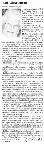 | Death | 21 May 2017 | Lu Ida Olive Klemme died on 21 May 2017 at Ft. Collins, Colorado, at age 94 LuIda Abrahamson, age 94, of Fort Collins, Colorado, formerly of Union County South Dakota and Akron, Iowa, passed away Sunday, May 21, 2017 at Brookdale Assisted Living Center in Fort Collins, after a brief illness. Funeral services will be 1:00 p.m. Wednesday, May 31, 2017 at Brule Creek Lutheran Church, rural Elk Point, South Dakota. Reverend Steve Martens will officiate. Burial will follow in Brule Creek Lutheran Cemetery. Visitation with the family present will be from 12:00 p.m. until service time on Wednesday at he church. Arrangements are with the Rexwinkel-Schroeder Funeral Home in Akron. Expressions of sympathy can be extended to the family through www.rexwinkelfh.com. LuIda Olive Abrahamson was born May 25, 1922 near Nora, South Dakota to Emil and Anna Klemme. She was baptized July 2, 1922 at Peace Lutheran Church in Alcester, South Dakota and confirmed in 1936 in Brule Creek Lutheran Church by Rev. W.I. Aamoth. LuIda lived her early years on a farm near Spink, South Dakota. She married Olaf Abrahamson January 19, 1942, and they resided on the family farmstead until 1971, when they moved to Akron, Iowa. Olaf passed away on January 30, 1987 at their home in Akron. LuIda later moved to Fort Collins in 1999. LuIda taught school for 26 years, retiring in 1984. She attended Southern State Teacher’s College, Morningside University and graduated from the University of South Dakota in 1970. She had been a member of Brule Creek Lutheran Church since 1929. She served as Sunday School teacher and superintendent for many years and also as Ladies Aid officer. She was a past member of Union County Extension Club for several years serving as chairman for 2 years. She also was member of Women’s Federated Club, Lions, Senior Citizens Club, Golf Club and card clubs. She enjoyed traveling, having been in 48 of the 50 states plus Mexico and Canada. Teaching school was a pleasure for her. After teaching eight grades in a rural one-room school for several years and then several years in Akron Community Schools she would always say, “I never had a student whom I did not like.” She also enjoyed sports on TV, puzzles of all kinds, playing cards and reading. Most of all she enjoyed her family for which she was forever thankful. She would often say, “Thank you Lord for a wonderful family.” LuIda is survived by her three sons James (Ceecy), Larry (LeAnn), and Curtis (Janene); ten grandchildren: Daniel, Deborah (Naoshi), David (Karen), Robert (Megan), Ryan (Tina), Marie, Collin (Heather), Timothy (Heather), Thomas (Adrianna), Tytus (Caroline); and 17 great-grandchildren. She is also survived by her sister Marge Flados of Harlingen, Texas, and several nieces and nephews. LuIda is preceded in death by her parents; husband, Olaf; her younger sister, Agnes Kinsley; brother-in-law, Berdell Kinsley; brother, Laverne Klemme; sister-in-law, LaVonne Klemme, and brother-in-law, Norman Flados. |