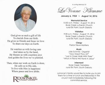 | Death | 14 August 2016 | LaVonne Jean Hornstein died on 14 August 2016 at age 92 Lavonne Klemme, 92, of Hawarden, Iowa, formerly of Akron, Iowa passed away Sunday, August 14, 2016 at Hillcrest Health Care Center in Hawarden. A Memorial Service will be at 10:30 a.m., Friday, August 19, 2016 at Brule Creek Lutheran Church in rural Elk Point, South Dakota with Pastor Steve Martens officiating. A visitation with the family present will be from 9:30 a.m. until the start of the service at the church. Burial will be at Brule Creek Lutheran Cemetery in rural Elk Point, South Dakota. |