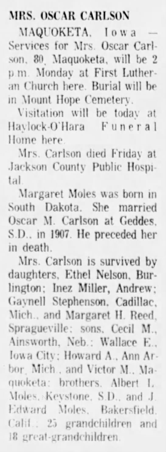 Children of Margaret Jane Moles and Oscar Martin Carlson