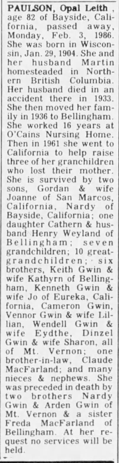 - Opal Leith Gwin+ b. 29 Jan 1904, d. 3 Feb 1986