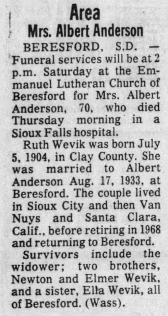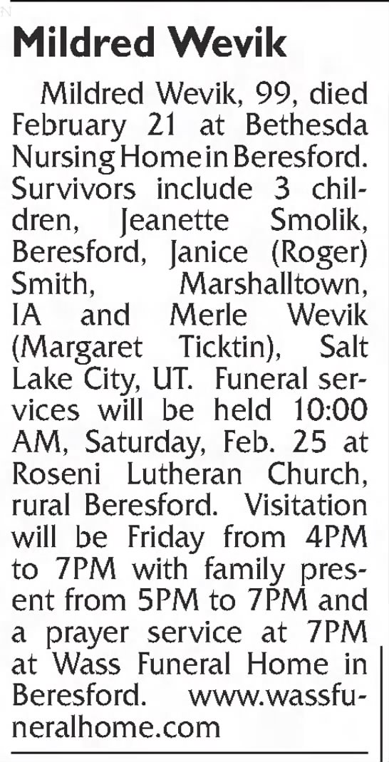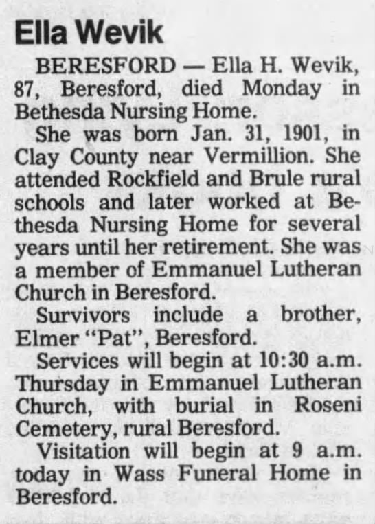 | Father* | Erick Wevik b. 14 May 1868, d. 30 Sep 1930 |