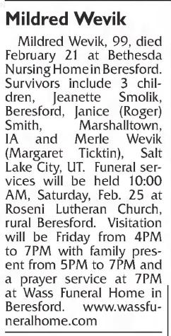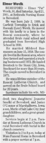 Child of Elmer Benhard Wevik and Mildred Elvida Rasmussen