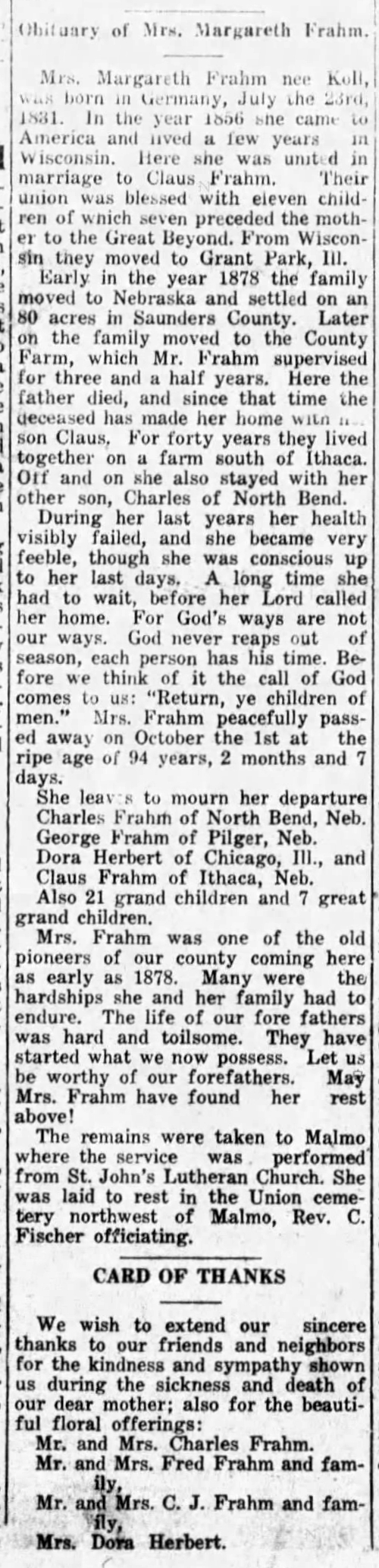 - Elizabeth Margaret Frahm b. 2 Feb 1871, d. 13 Mar 1925